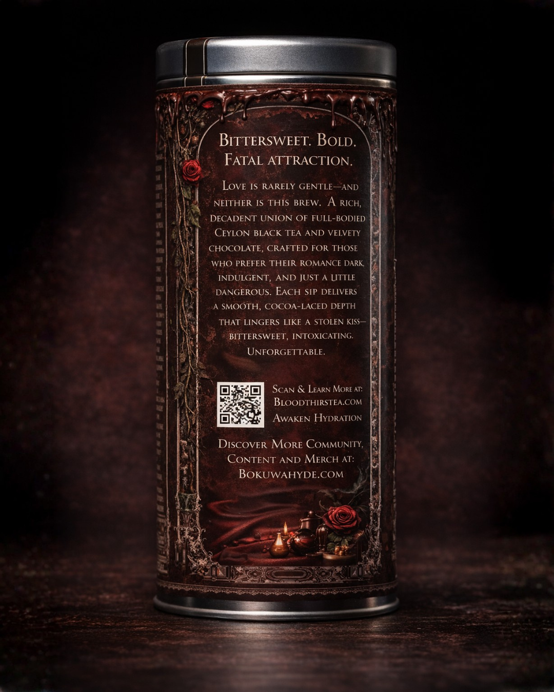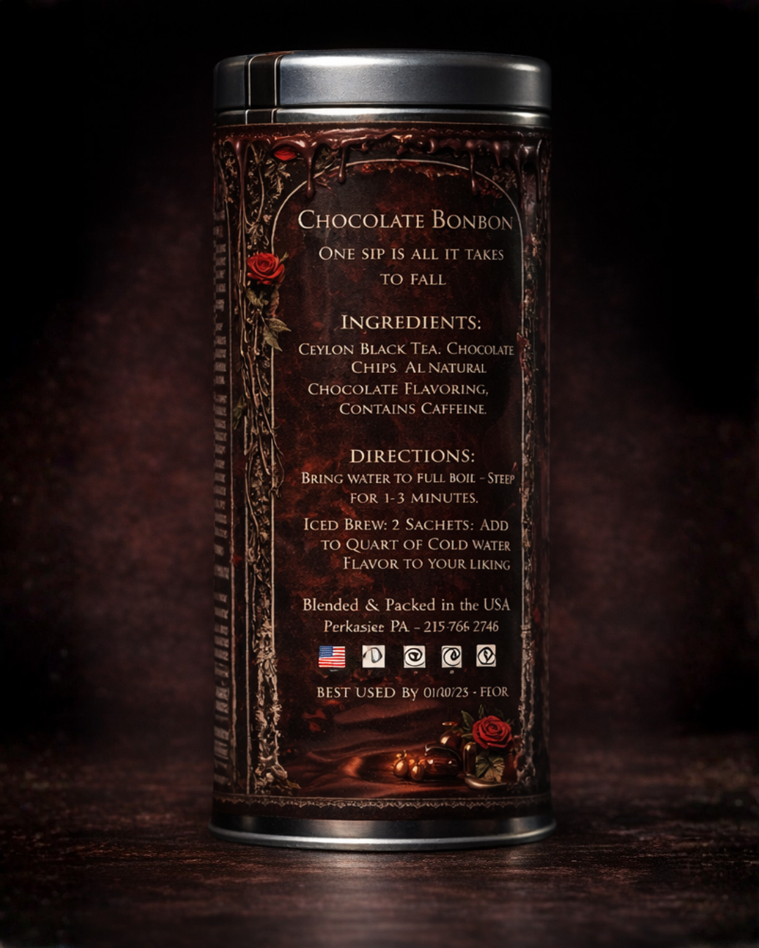 CUPID'S KISS Chocolate Bonbon Tea BITTERSWEET. BOLD. FATAL ATTRACTION. Love is rarely gentle—and neither is this brew. A rich, decadent union of full-bodied Ceylon black tea and velvety chocolate, crafted for those who prefer their romance dark, indulgent, and just a little dangerous. Each sip delivers a smooth, cocoa-laced depth that lingers like a stolen kiss—bittersweet, intoxicating, unforgettable. One sip is all it takes to fall. INGREDIENTS: Ceylon Black Tea, Chocolate Chips, All-Natural Chocolate Flavoring, Contains Caffeine Our signature plant-based pyramid sachets allow room for the tea leaves to expand—ensuring a better brew. Each sachet brews 2–3 cups or a small pot of tea. DIRECTIONS: Bring water to full boil • Steep for 1–3 minutes Iced: Brew 2 sachets • Add to quart of cold water • Flavor to your liking